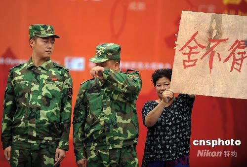 8月5日,奧運火炬在四川成都傳遞,在傳遞結束儀式上四川民眾為抗震官兵舉起“舍不得你們走”的標語,抗震官兵感動抹淚。 中新社發(fā) 廖攀 攝