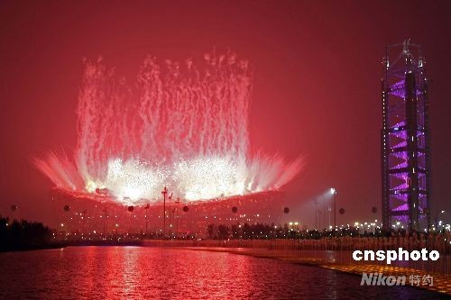 8月8日,第29屆夏季奧運(yùn)會(huì)在北京國(guó)家體育場(chǎng)開(kāi)幕,絢麗的煙火映紅北京的夜空。中新社發(fā) 盛佳鵬 攝