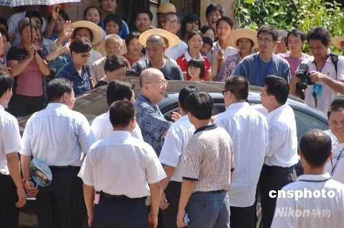八月十四日下午,中國(guó)國(guó)民黨主席吳伯雄在福建永定縣的高北土樓群參觀完后,上車(chē)前與鄉(xiāng)親話別,隨后乘車(chē)趕赴廈門(mén)。中新社發(fā) 鄭祚聲 攝