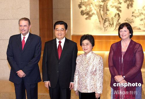圖為胡錦濤夫婦歡迎出席奧運(yùn)會閉幕式的國際奧委會主席羅格夫婦。
