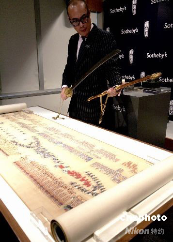 專家正在介紹珍稀乾隆御制《大閱第三圖 閱陣》手卷,及清乾隆御制金桃皮鞘“天字十七號”“寶騰”腰刀。中新社發(fā) 張勤 攝