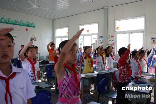 9月1日,四川省兩萬多所中小學(xué)新學(xué)期開學(xué),五十一個(gè)地震重災(zāi)縣的五千九百七十九所中小學(xué)校百分之百復(fù)課。圖為都江堰最大的板房學(xué)校皖川中心校的孩子們在教室里舉行升旗儀式。中新社發(fā) 黃永莉 攝