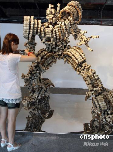 9月9日,上海雙年展國際學(xué)生展在創(chuàng)智天地拉開帷幕,國際學(xué)生展歷來是上海雙年展的主要藝術(shù)活動之一,本次展覽吸引了中外40余所一流設(shè)計(jì)院校前來參展。圖為一個(gè)由紡織廠廢棄物件組成的“變形金剛”吸引參觀者。中新社發(fā) 湯彥俊 攝