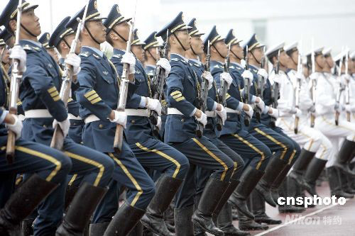 圖為駐港部隊(duì)槍械團(tuán)體操表演。中新社發(fā) 張勤 攝
