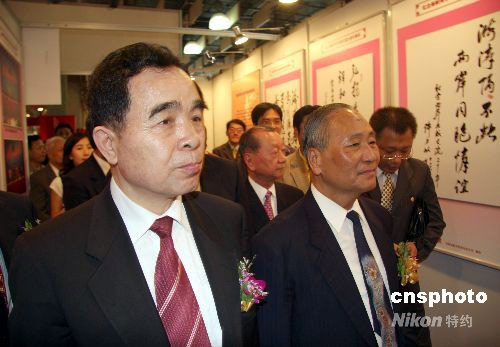 9月20日,紀(jì)念海峽兩岸出版交流二十周年圖片展在臺(tái)北世貿(mào)中心三館開幕。圖為參加活動(dòng)的大陸參訪團(tuán)團(tuán)長、紀(jì)念海峽兩岸出版交流二十周年系列活動(dòng)組委會(huì)名譽(yù)主任柳斌杰(左一),紀(jì)念海峽兩岸出版交流二十周年系列活動(dòng)組委會(huì)主任委員陳恩泉(左二)等參觀圖片展。中新社發(fā) 陳立宇 攝