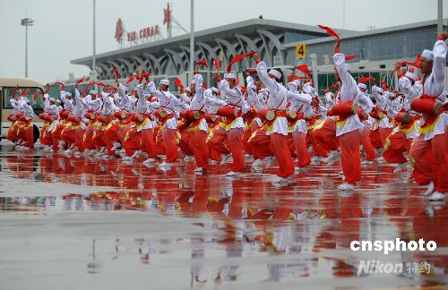 9月22日上午,以中共中央政治局常委、中央紀(jì)委書記賀國強(qiáng)為團(tuán)長的中央代表團(tuán),乘專機(jī)抵達(dá)銀川河?xùn)|機(jī)場,受到寧夏回族自治區(qū)官員和民眾的熱烈歡迎。圖為寧夏回族青年舞動腰鼓歡迎中央代表團(tuán)抵達(dá)銀川。中新社發(fā) 廖攀 攝