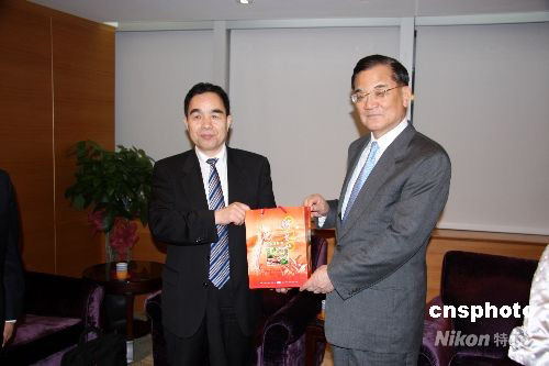 圖為會(huì)見時(shí)柳斌杰向連戰(zhàn)贈(zèng)送禮物。
