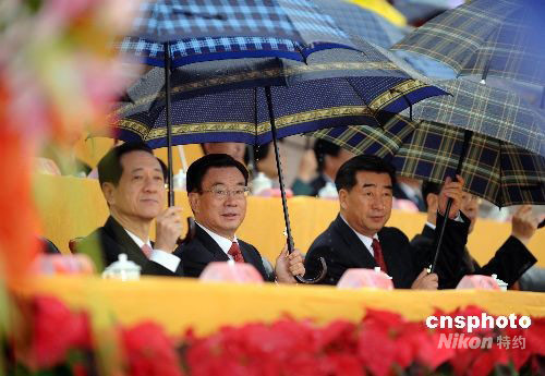 9月23日上午,干旱少雨的銀川降下甘露,寧夏回族自治區(qū)成立50周年慶祝大會在銀川覽山劇場隆重召開,中共中央政治局常委、中央紀(jì)委書記賀國強(qiáng)率中央代表團(tuán)出席。中新社發(fā) 廖攀 攝