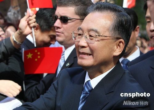 中國(guó)總理溫家寶當(dāng)?shù)貢r(shí)間23日上午乘專機(jī)抵達(dá)紐約,數(shù)千華僑華人當(dāng)天一早即聚集在他下榻的酒店附近,揮舞中美兩國(guó)國(guó)旗夾道歡迎。中新社發(fā) 李靜 攝