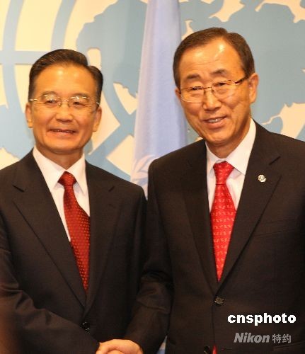 9月23日晚,中國總理溫家寶在紐約聯(lián)合國總部與聯(lián)合國秘書長潘基文舉行會晤。中新社發(fā) 李靜 攝