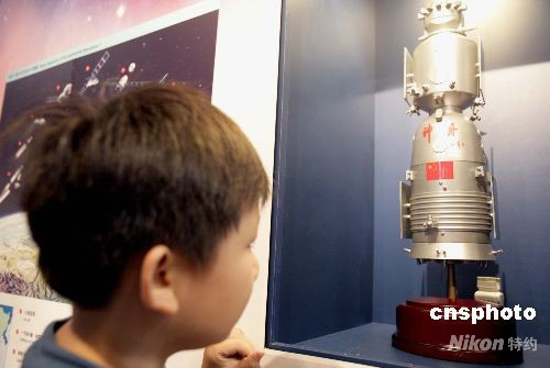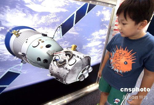 九月二十四日,一位小朋友被“神舟七號——中國首次太空漫步”展上的神舟太空船宣傳畫所吸引。當日起,香港太空館舉行相關展覽,讓市民加深對神舟七號、以及中國載人航天科技發(fā)展的認識。中新社發(fā) 張勤 攝