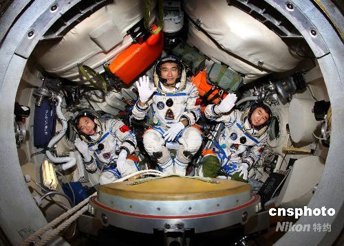 2008年9月25日晚,中國“神舟七號”載人飛船成功發(fā)射。圖為“神舟七號”航天員出征前訓(xùn)練圖片。中新社發(fā) 秦憲安 攝