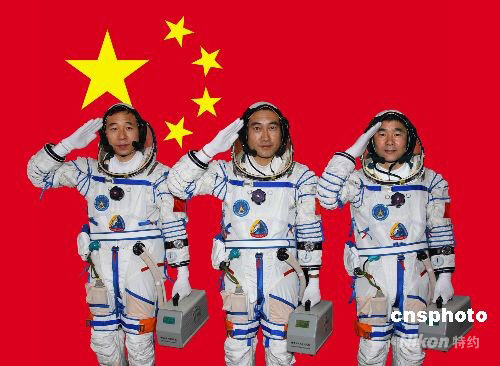 執(zhí)行神舟七號載人航天飛行任務(wù)的航天員翟志剛(中)劉伯明(右)景海鵬(左)向祖國和人民致以莊嚴的軍禮。中新社發(fā) 秦憲安 攝