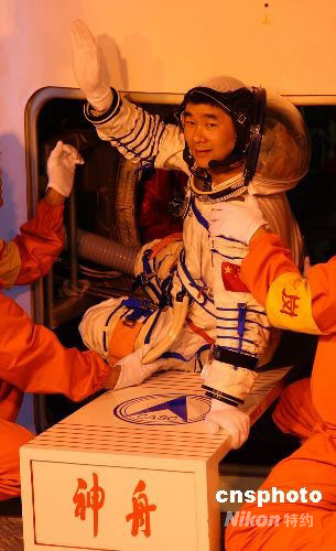 劉伯明進(jìn)入神舟七號(hào)飛船返回艙。 中新社發(fā) 秦憲安 攝