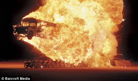美國拉斯維加斯特技人史蒂夫則駕駛自己的黃色公交校車成功地越過地下擺放有15輛摩托車且還穿過一個巨大的火球,整個跨越距離達33.2米,這也創(chuàng)造了世界紀錄。