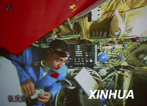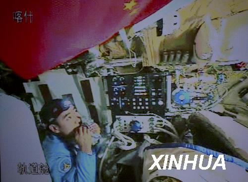 9月26日23時(shí)01分,手持食品袋的航天員翟志剛在神舟七號(hào)飛船軌道艙內(nèi)進(jìn)食(拍攝于北京航天飛行控制中心大屏幕)。新華社記者 查春明 攝