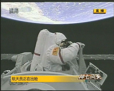 9月27日16時44分許,“神七”航天員翟志剛走出艙外開始實施出艙活動。