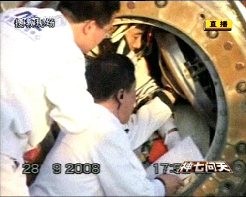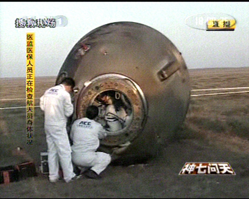 神舟七號飛船返回艙順利著陸,返回艙外觀檢查正常,搜救隊員按程序打開返回艙艙門,醫(yī)監(jiān)醫(yī)保人員檢查航天員身體狀況。經(jīng)醫(yī)監(jiān)醫(yī)保人員檢查,三名航天員身體狀況良好。三人面帶笑容。