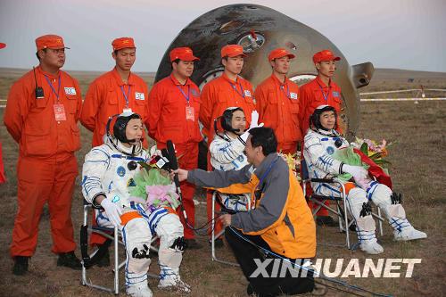 9月28日,神七航天員出艙后接受記者采訪(fǎng)。新華社記者王建民攝