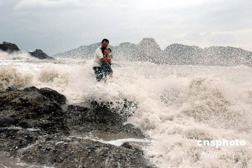 9月28日,受超強(qiáng)臺風(fēng)“薔薇”影響,浙江溫州市洞頭島海域已是波濤洶涌,海礁上掀起的巨浪高達(dá)10多米。下午2時許,一對外地父女在海邊游玩時不慎被突漲的潮水困在礁石上,隨時可能被海浪吞噬。正在海邊巡邏的洞頭邊防大隊(duì)官兵發(fā)現(xiàn)險情后,迅速展開緊急營救,成功將父女從海浪中安全救上岸。中新社發(fā) 吳水斌 攝