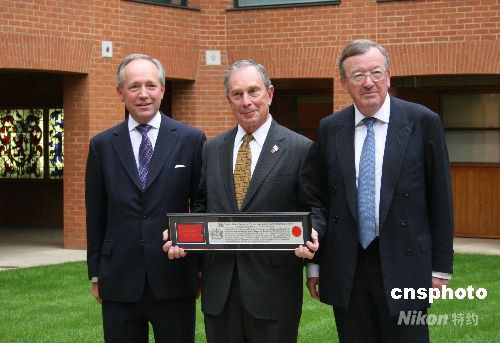 當(dāng)?shù)貢r間6日下午,訪問倫敦的紐約市長邁克爾·布隆博格獲頒倫敦金融城“自由民”證書。擁有該榮譽(yù)后,布隆博格將有權(quán)趕著羊和牛通過倫敦橋。圖為布隆博格手持證書與倫敦金融城資源與政策委員會主席斯圖亞特·弗雷澤(右)和副主席邁克爾·斯奈德(左)合影。中新社發(fā) 李鵬 攝