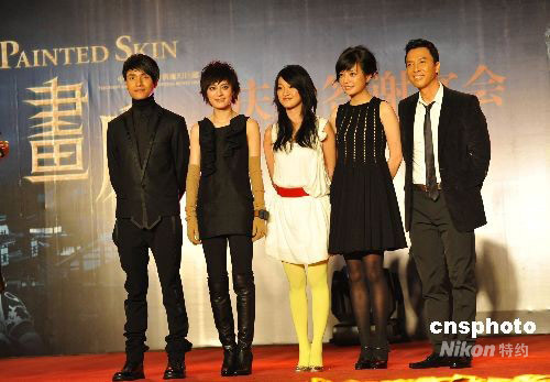 10月8日,電影《畫皮》舉行盛大慶功會,慶祝奇跡票房紀(jì)錄。9月26日引爆全國院線的東方新魔幻影片《畫皮》在上映當(dāng)日票房達到1520萬元,隨后6天過億,10天狂收1.43億,在同等時間內(nèi),該成績已超過《投名狀》、《集結(jié)號》、《長江七號》等多部國產(chǎn)大片。截至10月8日,該片票房已高達1.7億。面對此驕人成績,制片方更放出豪言——《畫皮》過兩億沒有懸念。圖為《畫皮》主演陳坤、孫儷、周迅、趙薇、甄子丹在慶功會現(xiàn)場。中新社發(fā) 李學(xué)仕 攝