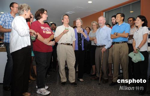 當(dāng)?shù)貢r(shí)間10月8日下午,美國加州大學(xué)圣地亞哥分校醫(yī)學(xué)院和藥理學(xué)系,為剛剛榮獲諾貝爾化學(xué)獎(jiǎng)的華裔科學(xué)家錢永健舉行慶祝會(huì)。錢永健和夫人溫迪,以及他的同事、學(xué)生等近百人出席。中新社發(fā) 張煒 攝