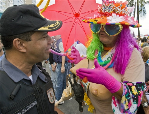 10月12日,巴西里約熱內(nèi)盧沿科巴卡巴那海灘舉行同性戀大游行,圖為一位易裝癖者在同警察調(diào)侃。
