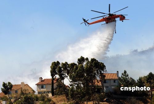 消防直升機(jī)從住宅上空瀉下消防用水。中新社發(fā) 張煒 攝