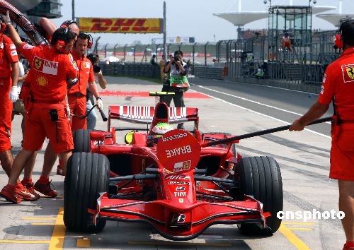 10月17日上午,2008世界一級方程式錦標賽第17站中國站的比賽在上海國際賽車場開始進行第一次自由練習賽,目前在車隊積分榜上領跑的法拉利車隊多次演練賽中加油。在新加坡賽站發(fā)生嚴重的“加油事故”后,法拉利車隊恢復了傳統(tǒng)的“棒棒糖”指揮車手的方法。中新社發(fā) 任晨鳴 攝