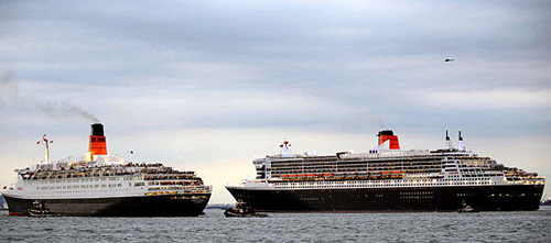 10月16日,巨型郵輪“伊麗莎白女王二號”(左)與“瑪麗女王二號”在美國紐約港相會。當天,這兩艘豪華郵輪在紐約港會合,隨后一起駛回倫敦。已運營逾40年的豪華郵輪“伊麗莎白女王二號”將在這次航行之后退役,然后被改造成一座水上五星級酒店,?吭诎⒙(lián)酋迪拜的朱邁拉棕櫚島旁。