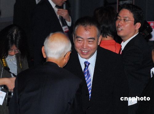 圖為陳凱歌在電影周開幕式上與日本同行寒暄,他被本屆東京電影節(jié)授予“黑澤明獎”。中新社發(fā) 侯宇 攝