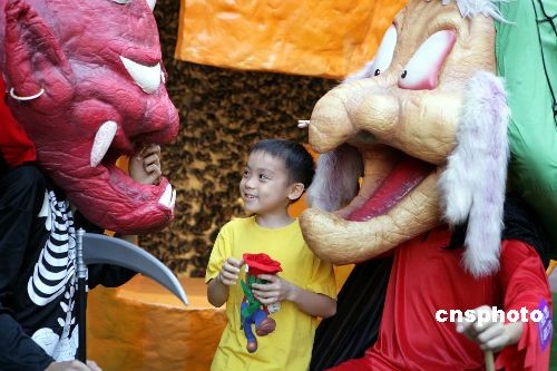 圖為西方“鬼節(jié)”中的紅魔鬼與小朋友嬉戲玩樂(lè)。