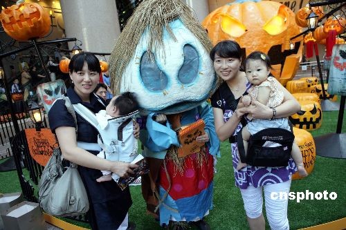 十月二十一日,兩名游客懷抱嬰兒在香港時(shí)代廣場(chǎng)與稻草人合影。