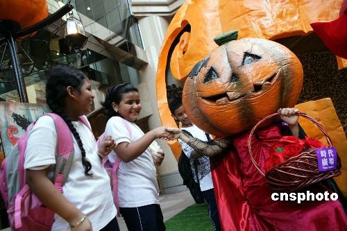 十月二十一日,兩名南亞小學生在香港時代廣場與南瓜人開心嬉戲。當日,香港時代廣場為迎接萬圣節(jié)設置的“怪異南瓜陣”開幕,吸引許多游客駐足玩樂。中新社發(fā) 洪少葵 攝