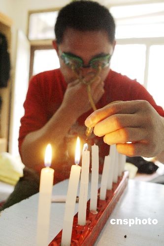10月21日,開(kāi)封民間藝人凌春江用眼睛將蠟燭吹滅。他戴上特制的眼鏡,從兩眼中聚氣到一根管子內(nèi),一分鐘吹滅一排蠟燭。如今,身懷絕技的凌春江被中華民間絕技藝術(shù)團(tuán)聘為特邀演員,經(jīng)常到全國(guó)各地巡演。中新社發(fā) 慎重 攝