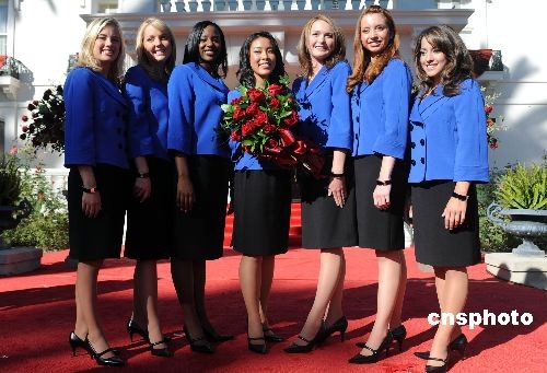 十七歲的華裔高中生李君慧(中)十月二十一日當(dāng)選二00九年度美國(guó)“玫瑰皇后”,她將引領(lǐng)二00九年元旦舉行的第一百二十屆帕薩迪納玫瑰花車(chē)大游行和九十五屆“玫瑰碗”杯美式足球總決賽。中新社發(fā) 張煒 攝
