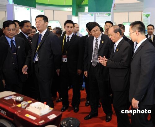 出席第五屆中國(guó)—東盟博覽會(huì)的緬甸總理登盛(右二),十月二十一日巡視了展館。他對(duì)中國(guó)和緬甸的農(nóng)業(yè)合作表現(xiàn)出濃厚的興趣。中新社發(fā) 蔣雪林 攝