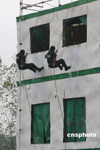 10月21日上午,遂寧市公安特警在進行反劫持人質(zhì)演習(xí)。當(dāng)天,四川遂寧市公安大練兵暨反恐演習(xí)舉行。中新社發(fā) 鐘 敏 攝