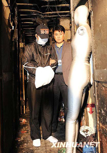 10月23日上午,韓國警方與20日在首爾某旅館制造縱火行兇事件的嫌犯鄭某(戴口罩者)到案發(fā)現(xiàn)場取證。鄭某在20日的縱火行兇事件中造成6死7傷,有三名中國婦女被鄭某殺害,另有三名中國婦女受傷。新華社/韓國紐西斯通訊社