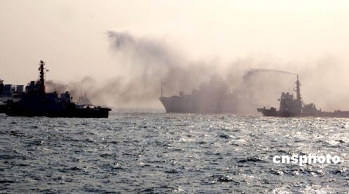 圖為救助船舶為發(fā)生“爆炸著火”的船只滅火。中新社發(fā) 王東明 攝