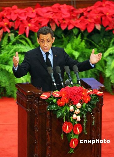 法國(guó)總統(tǒng)薩科齊在開(kāi)幕式上發(fā)表講話。中新社發(fā) 廖文靜 攝