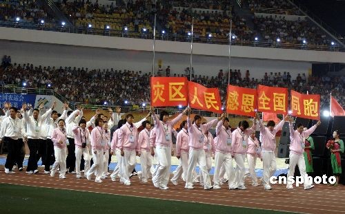 開幕式上,四川代表團進場時高舉“災區(qū)人民感恩全國同胞”的橫幅,激起全場熱烈掌聲。中新社發(fā) 王東明 攝