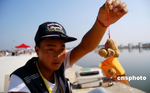 十月二十八日,在福建南安八月湖舉行的第六屆全國(guó)農(nóng)運(yùn)會(huì)釣魚比賽正有條不紊進(jìn)行著。圖為拋桿釣比賽選手做好的魚食尤為有趣。中新社發(fā) 傅丹丹 攝
