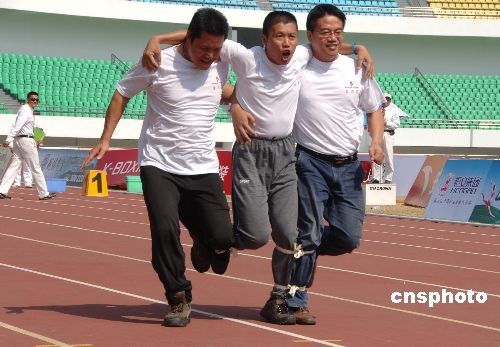 十月二十八日,臺灣選手邱學(xué)申、梁世英、汪勛武(中)在農(nóng)運(yùn)會“男子60米3人四足跑”比賽中同心協(xié)力爭向前。賽后汪先生在接受媒體采訪時說:這是他第二次參加全國農(nóng)運(yùn)會,上一屆他是以臺灣游泳隊(duì)領(lǐng)隊(duì)身份參賽。中新社發(fā) 鄭祚聲 攝