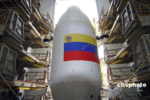 發(fā)射前位于運載火箭頂部的衛(wèi)星整流罩外印有委內(nèi)瑞拉國旗。中新社發(fā) 尹濤 攝