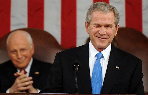 布什在國會(huì)山發(fā)表最后一次國情咨文講話前,向臺(tái)下的一位觀眾擠眼睛。作者:旺仔