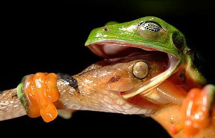 一只樹(shù)蛙(北美洲樹(shù)蟾科)與一條蛇進(jìn)行生死決斗。