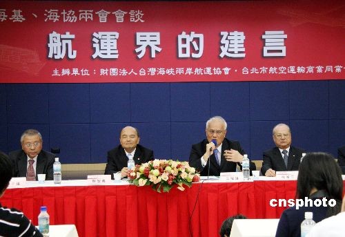 10月30日下午,臺(tái)灣?蘸竭\(yùn)業(yè)界代表由臺(tái)灣海峽兩岸航運(yùn)協(xié)會(huì)常務(wù)顧問(wèn)、長(zhǎng)榮集團(tuán)首席副總裁林省三牽頭,與臺(tái)灣領(lǐng)導(dǎo)人馬英九見(jiàn)面并遞交陳情書,希望即將在臺(tái)北登場(chǎng)的陳云林與;鶗(huì)董事長(zhǎng)江丙坤會(huì)談能排除萬(wàn)難,實(shí)現(xiàn)?罩焙,促進(jìn)兩岸經(jīng)貿(mào)發(fā)展,造福于民。隨后,他們?cè)谂_(tái)北舉行記者會(huì),表示非常歡迎海協(xié)會(huì)會(huì)長(zhǎng)陳云林訪臺(tái),并期盼兩岸直航早日落實(shí)。中新社發(fā) 黃少華 攝