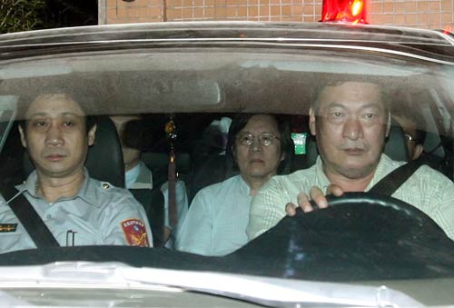 臺(tái)灣特偵組30日晚間傳喚臺(tái)當(dāng)局前“國(guó)安會(huì)秘書長(zhǎng)”邱義仁(中)及5名證人到案。檢察官偵訊后認(rèn)為邱義仁涉嫌利用職務(wù)詐取財(cái)物罪嫌,于31日凌晨將邱義仁移送法院聲請(qǐng)羈押禁見。臺(tái)北法院審理后裁準(zhǔn),邱義仁坐進(jìn)囚車,被送往臺(tái)北看守所!爸醒肷纭眻D